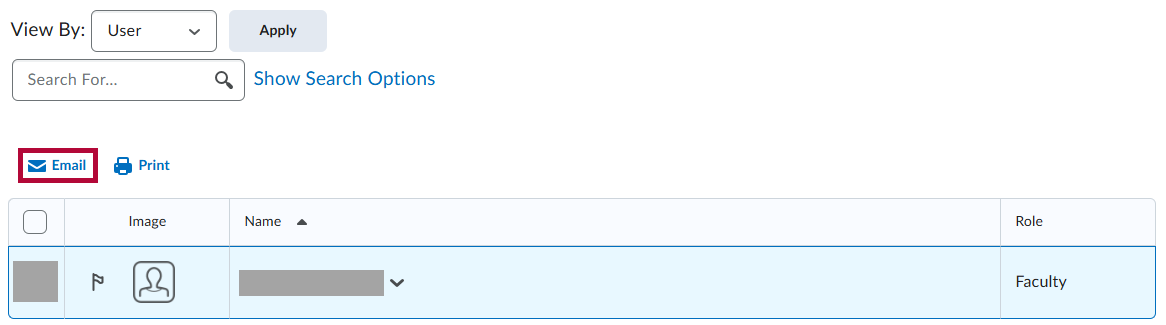 - Check the box next to the name(s) of students or faculty and select [Email]. This will open the Compose New Message screen. Please refer to the Send Emails in D2L using the Classlist for the next steps.